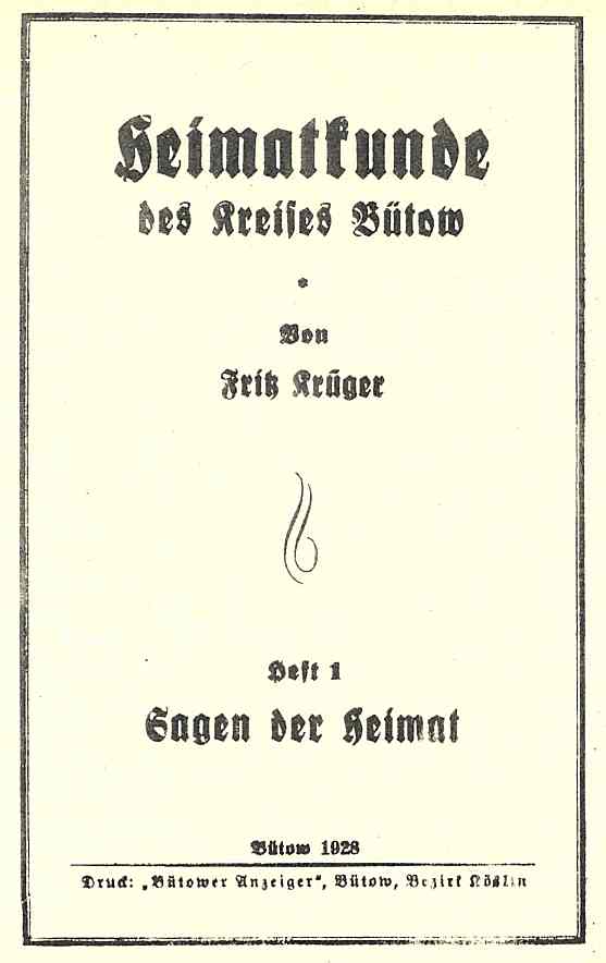 Um nun die Sagen unserer Stadt und unseres Kreises, die doch zum großen Teil recht interessant sind, zu erhalten, habe ich sie gesammelt und zum Teil aus "Volkssagen, Erzählungen, Aberglauben, Gebräuche und Märchen aus dem östlichen Hinterpommern" gesammelt von Otto Knoop, Gymnasiallehrer in Posen, ferner aus "Volkssagen aus Pommern und Rügen" gesammelt von Dr. Ulrich Jahn und aus Professor Dr. A. Haas: "Deutscher Sagenschatz, 1. Band: Pommersche Sagen" zusammengestellt.